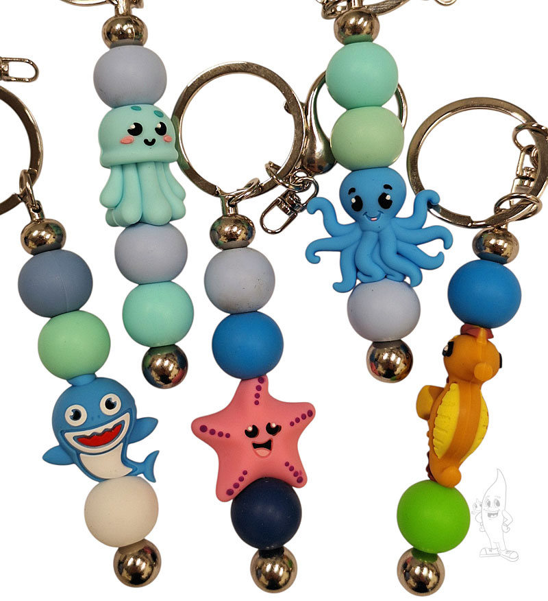 Leuke dieren sleutelhanger, handgemaakt door Aquaplantsonline. De sleutelhanger bevat 1 diertje en 2 of 3 balletjes die random blauw, wit en groene kleuren hebben, afhankelijk van de ruimte op de sleutelhangerpen.