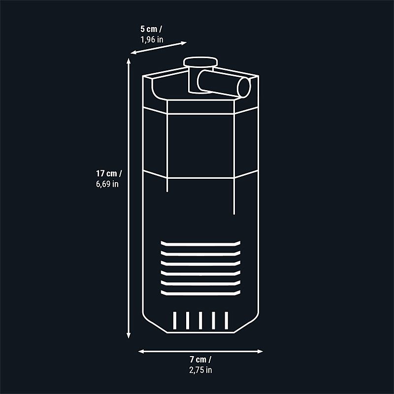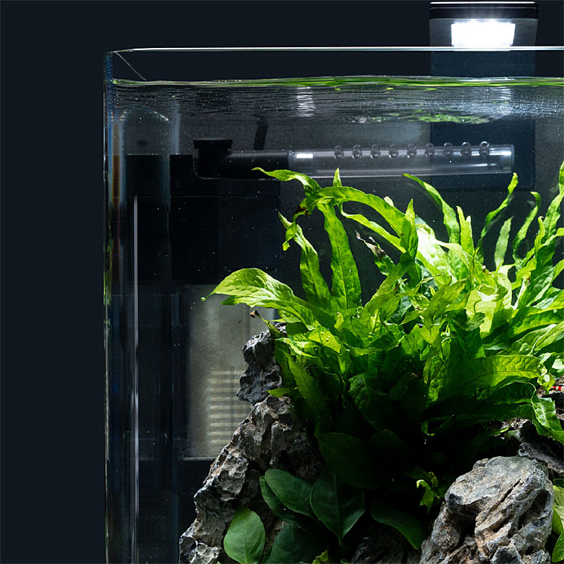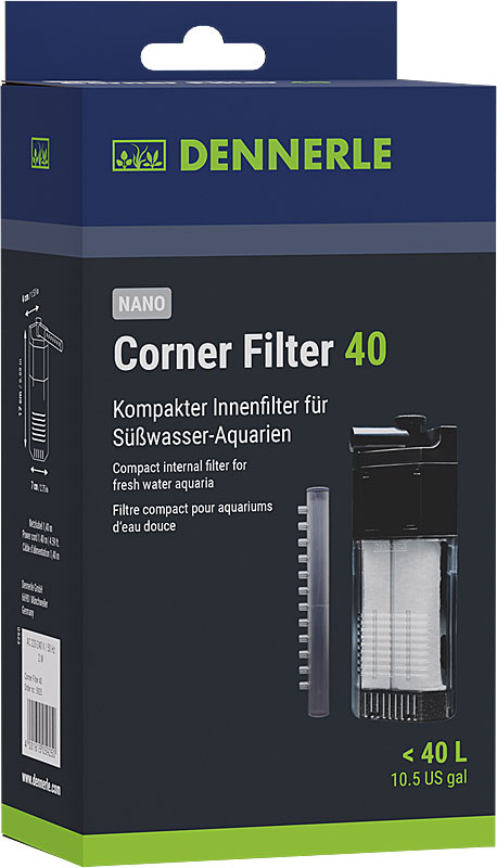 Dennerle Nano Corner filter 40 is een krachtig binnen filter met een pompcapaciteit van 150 l/uur. Daarbij loopt de pomp zo rustig en stil dat hij praktisch niet te horen is. De waterdoorstroming kan traploos worden ingesteld en de waterstroom kan door de met 90 graden draaibare filteruitlaat in elke gewenste richting worden geleid. Het filter beschikt over een sproeibuis met geïntegreerde reinigingsschuif en een miniborsteltje voor het gemakkelijk schoonmaken van de sproeiopeningen. Dankzij de smalle aanzuigopeningen en een voorfilterspons met zeer fijne poriën is de Nano Corner filter 40 ook veilig voor jonge garnalen.