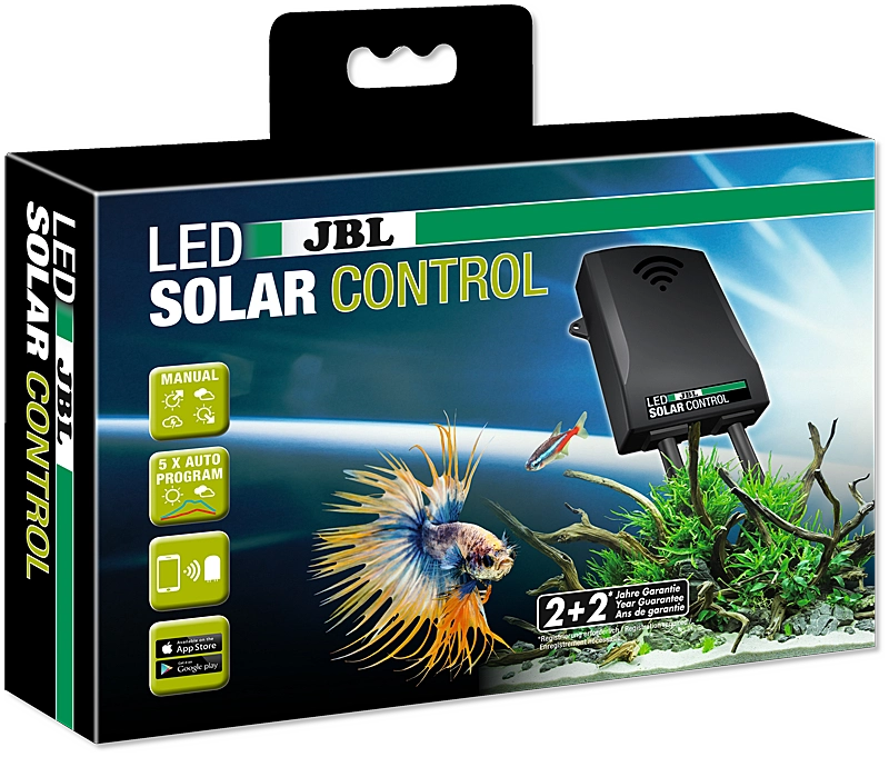 Bij de JBL LED Solar Natur LED verlichting zit al standaard een afstandbediening inbegrepen. Met deze afstandsbediening heeft u de mogelijkheid het licht in etappes te dimmen en kunt u kiezen uit drie kleurtemperaturen. Zodra u uw JBL LED Solar Natur (ideaal is een combinatie met JBL LED Solar Effect) gaat uitbreiden met de JBL LED Solar Control, dan opent zich een geheel nieuwe wereld. Middels de JBL LED Solar Control heeft u de mogelijkheid een leefruimte lichttechnisch met droogte en regentijd evenals onweer nauwkeurig na te bootsen. Maar ook een perfecte verlichting voor een sterk beplant aquascaping aquarium is heel eenvoudig in te stellen. JBL heeft in de Control al 5 aquarium types voorgeprogrammeerd. Namelijk de Rio Pantanal, Dreamscape, Malawi Rocks, Goldfish Paradise en Gezelschapsaquarium. De leds zullen dan de daar aanwezige klimaatsituatie, afhankelijk van het jaargetijde (incl. droogte en regenperioden, onweer en bewolking) imiteren. Voor een goudvisaquarium wordt de verlichting speciaal gericht op het benadrukken van de fraaie kleuren en bij een gezelschapsaquarium wordt de verlichting zo ingesteld dat een tropendag met 10 uur zon, het juiste licht voor planten en krachtige kleuren van de vissen weergeeft. Onweer en bewolking worden door een toevalsgenerator bepaald. Voor liefhebbers van sterk beplante aquaria (aquascaping) is er een lichtprogramma dat het programma van gezelschapsaquarium aanhoudt maar met een hogere lichtintensiviteit. Voor elk programma kan om te beginnen een acclimatiseringsmodus worden ingesteld die de overgang van TL buizen naar het wezenlijk fellere ledlicht vereenvoudigt en problemen voorkomt. Natuurlijk kan elk programma ook zonder acclimatisering worden geselecteerd. U kunt in de handmatige modus ook zelf gekozen lichtsituaties instellen. Voor de genoemde programma’s staan 2 LED units tot uw beschikking, de JBL LED Solar Natur en de JBL LED Solar Effect. Wanneer u de JBL LED Solar Natur zonder de JBL LED Solar Effect met de JBL LED Solar Control wilt aansturen kunt u weliswaar alle functies, zoals onweer, bewolking, zonsop- en –ondergang, gebruiken maar dan zonder de bijbehorende kleureffecten! Zeer eenvoudig te monteren en dankzij een gratis APP voor uw mobiele telefoon ook eenvoudig te bedienen.