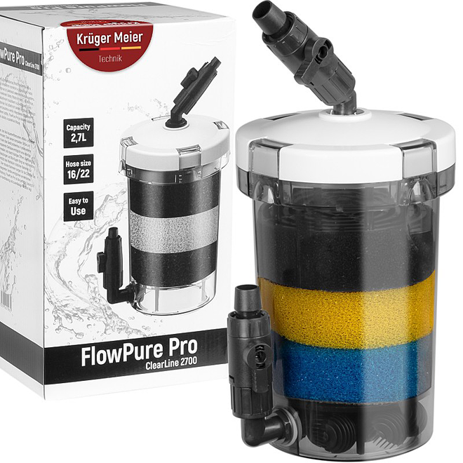 De Kruger Meier FlowPure Pro 2700 is een externe voorfilter die verstopping van het hoofdfilter voorkomt, waardoor dit langer optimaal kan functioneren en minder vaak schoongemaakt hoeft te worden. Dankzij drie sponzen met verschillende grofheden en bioballen worden vuil, bezinksel en organische resten effectief opgevangen, waardoor het water langer helder blijft.