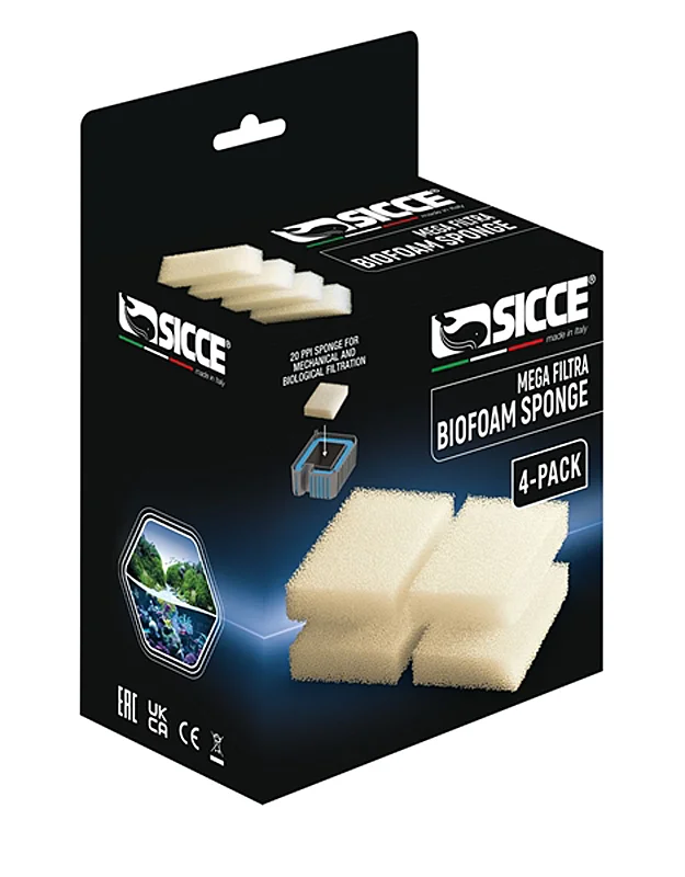 De Sicce Mega Filtra Biofoam is een 20 PPI mechanische en biologische filtratie spons gemaakt van poreus filterschuim (foam) en geschikt voor de Sicce Mega Filtra 950 SDC, Sicce Mega Filtra 900 en de Sicce Mega Filtra 650.