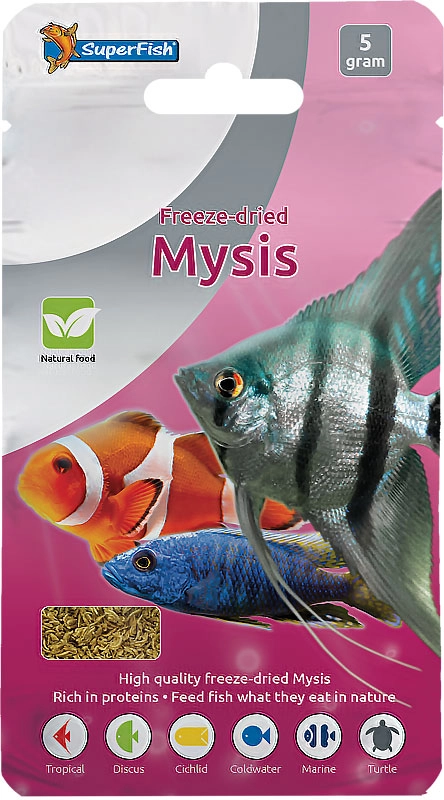 Superfish Freeze Dried Mysis (gevriesdroogde brakwatergarnalen) is een krachtig en natuurlijk visvoer dat bekendstaat om het hoge eiwitgehalte. Van nature bevatten mysis chitosan, een stof die helpt bij het ondersteunen van een sterk immuunsysteem en de algehele gezondheid van aquariumdieren.