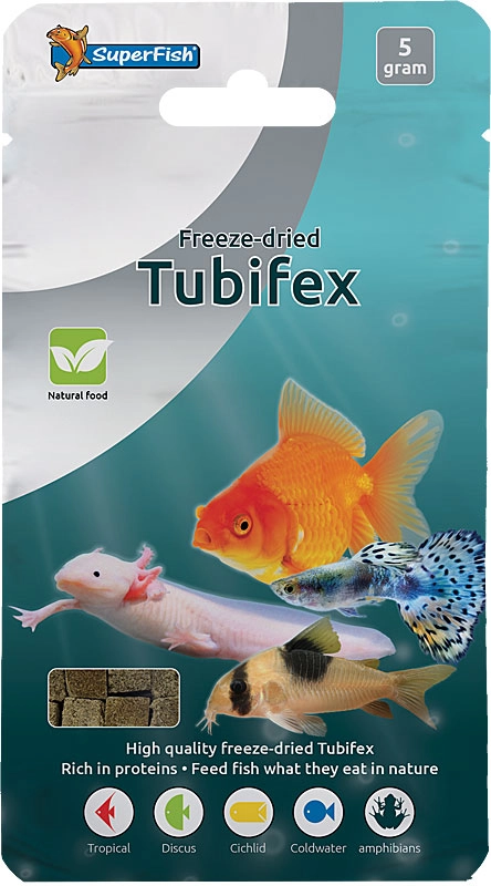 Superfish Freeze Dried Tubifex (gevriesdroogde borstelwormen) is een natuurlijk en bijzonder eiwitrijk visvoer. Deze wormen zijn een zeer smakelijke traktatie en worden door vrijwel alle zoetwatervissen en koudwatervissen probleemloos geaccepteerd.
