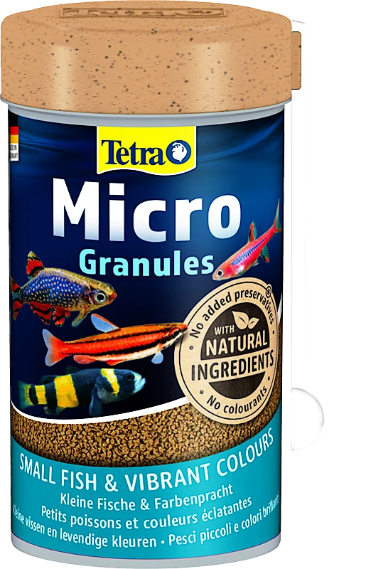 Tetra Micro Granulaat is een compleet hoofdvoer voor alle siervissen met kleine monden die zich voeden in het midden- en bodemgebied van het aquarium. De extra fijne korrels (0,3–1 mm) worden snel zacht in het water, waardoor zelfs de kleinste vissen ze moeiteloos kunnen eten.