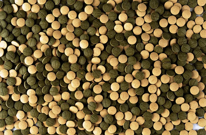 Samenstelling: Melk en -bijprodukten. Vis en -visbijprodukten. Plantaardige eiwitextracten. Granen. Gist. Algen(Spirulina Maxima 5.9%). Schaal- en weekdieren. oliën en vetten. Suiker. Mineralen. Analytische bestanddelen: Ruw eiwit 43.0%. Ruw vet 5.0%. Ruwe celstof 1.5%. Vochtgehalte 8.0%. Toevoegingen: Vitaminen. provitaminen en chemisch duidelijk omschreven stoffen met een gelijkaardige werking: Vitamine A 16840 IE/kg. Verbindingen van sporenelementen: E5 Mangaan 56 mg/kg. E6 Zink 33 mg/kg. E1 IJzer 22 mg/kg. E3 Kobalt 0.4 mg/kg. Kleurstoffen. Antioxidanten.