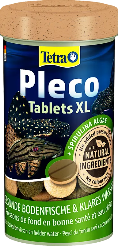 Pleco XL tablets van Tetra is het optimale, gevarieerde voedsel voor schuwe vissen en vissen die hun voedsel vanaf de bodem opnemen. Uitgebalanceerd premium tabletvoer voor alle grotere plantenetende bodemvissen. Groenvoertabletten met een groot aandeel spirulina algen. Ideaal afgestemd op de speciale voedingsbehoeften van plantenetende meervallen en zuigmeervallen. De tabletten zinken snel naar de bodem, kunnen geplaatst worden waar gewenst en vallen langzaam uiteen