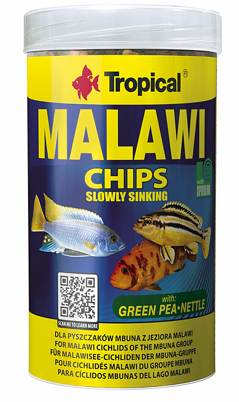 Malawi Chips is een premium multi-ingrediëntenvoer in de vorm van langzaam zinkende chips, speciaal ontwikkeld voor mbuna en andere herbivore Malawi cichliden. Leverbaar in 250 ml en 1000 ml.