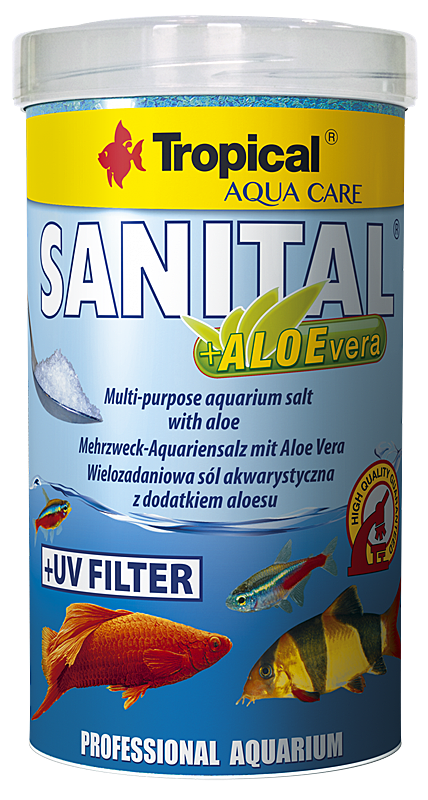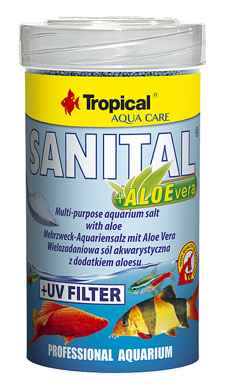 Tropical Sanital + Aloevera is een speciaal ontwikkeld aquariumzout voor preventief gebruik en behandelingen bij vissen, bijvoorbeeld na transport en tijdens de volledige acclimatisatieperiode. De actieve bestanddelen ondersteunen het herstel van vissen en helpen ionenstoornissen te corrigeren die kunnen ontstaan door ongunstige omgevingsfactoren. Leverbaar in 100 ml/12 gram, 500 ml/600 gram en 1000 ml/1,2 kg