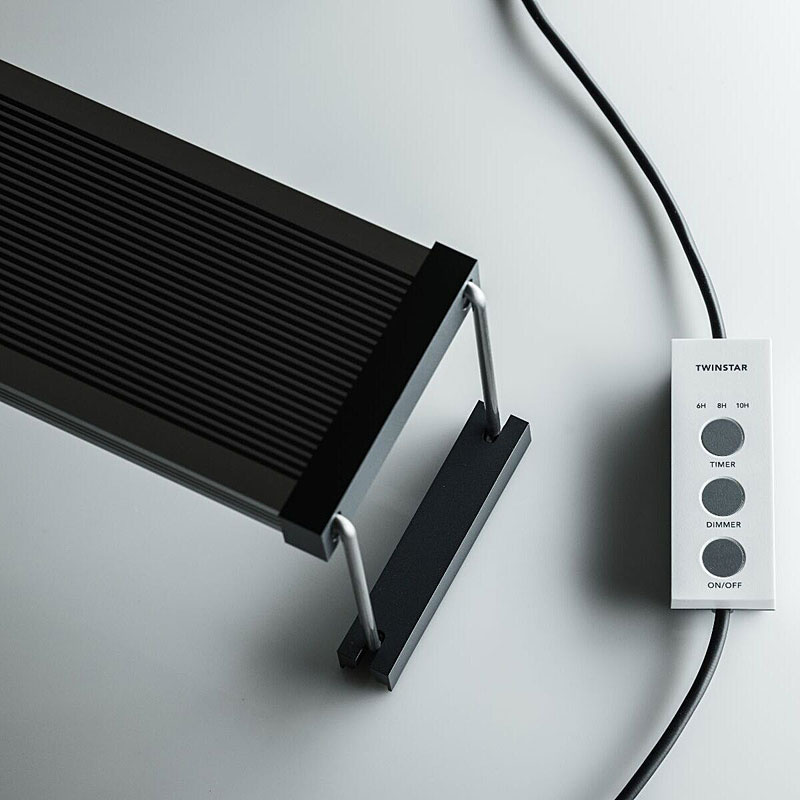 De Twinstar E-Line IV wordt geleverd incl. een inline-dimmer. De dimmer heeft 7 niveaus van helderheidsregeling en een ingebouwde timer die kan worden ingesteld op intervallen van 6 uur, 8 uur, 10 uur. Er is een aan/uit-knop om het licht op elk moment aan en uit te zetten. De functie "Langzaam starten en vertragen", die het licht gedurende 10 minuten langzaam aan en uit laat gaan, zorgt voor een stabiele leefomgeving voor de vissen in het aquarium (zonsopgang/zonsondergang).
